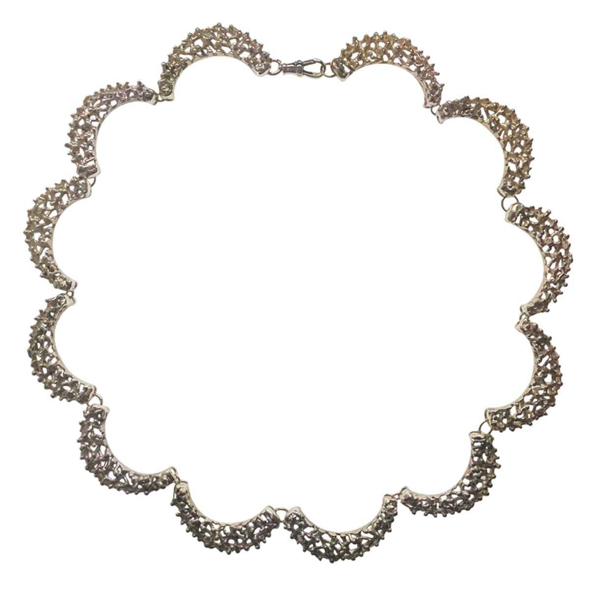 Individual crescent shapes from the twiggy pattern are articulated together into a stunning necklace. Total length 18″.